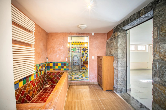 The lower level has a small cinema room, a fitness room or games room, a hammam area with a relaxation area, a guest toilet and a laundry room.