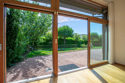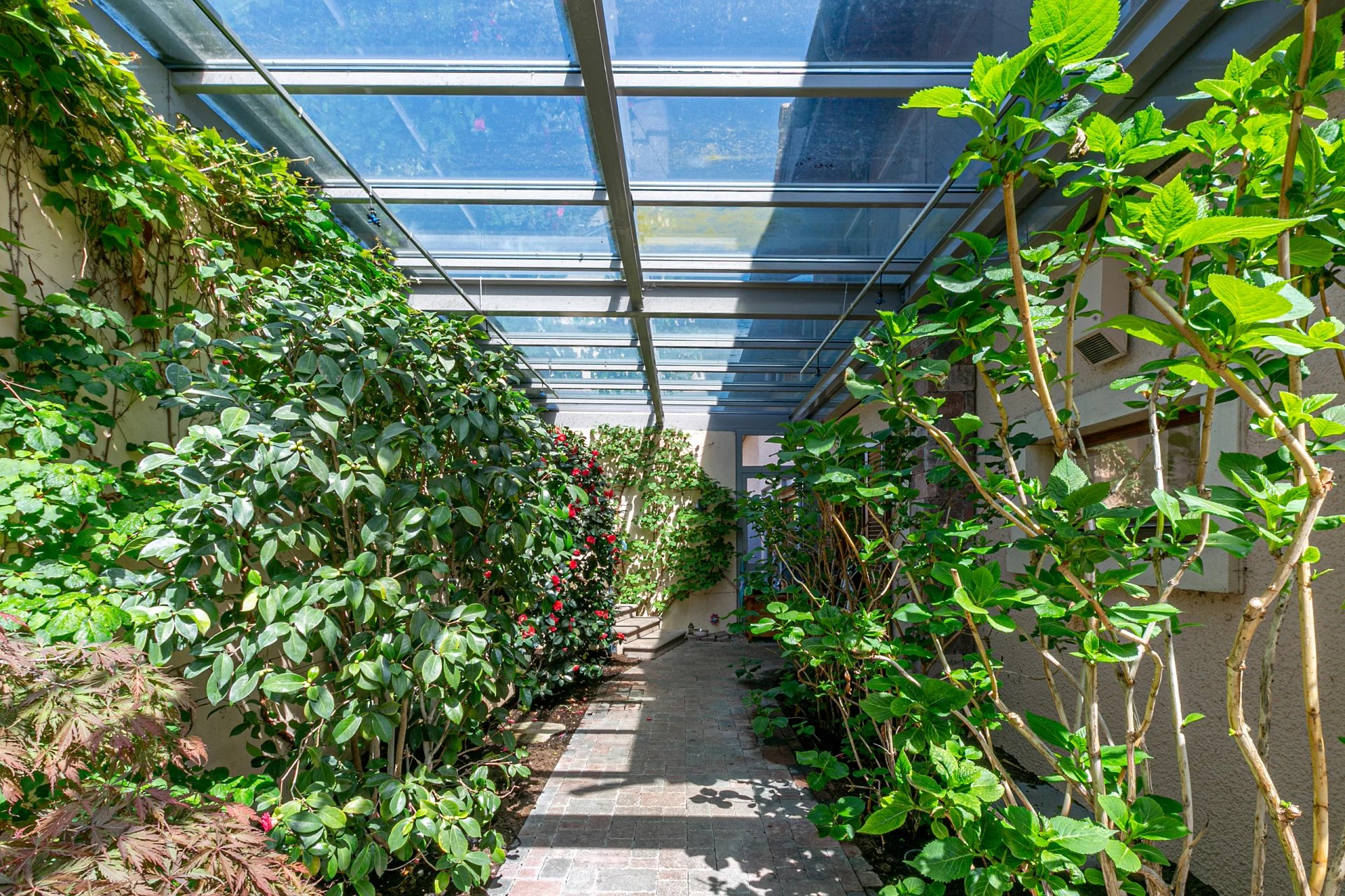 Twinned by the garages, important transformations were carried out in 2010, the house was enlarged by transforming the garage into a living room and an entrance greenhouse with electric blinds was created.