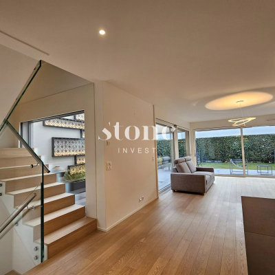 Magnificent 170m2 single-story villa in Chéserex, contemporary style with an outstanding renovation, entrance, equipped kitchen open on dining room, living room with fireplace, terrace, garden, 3 bedrooms on the ground floor and another in the basement, 4 bathrooms for each bedroom.