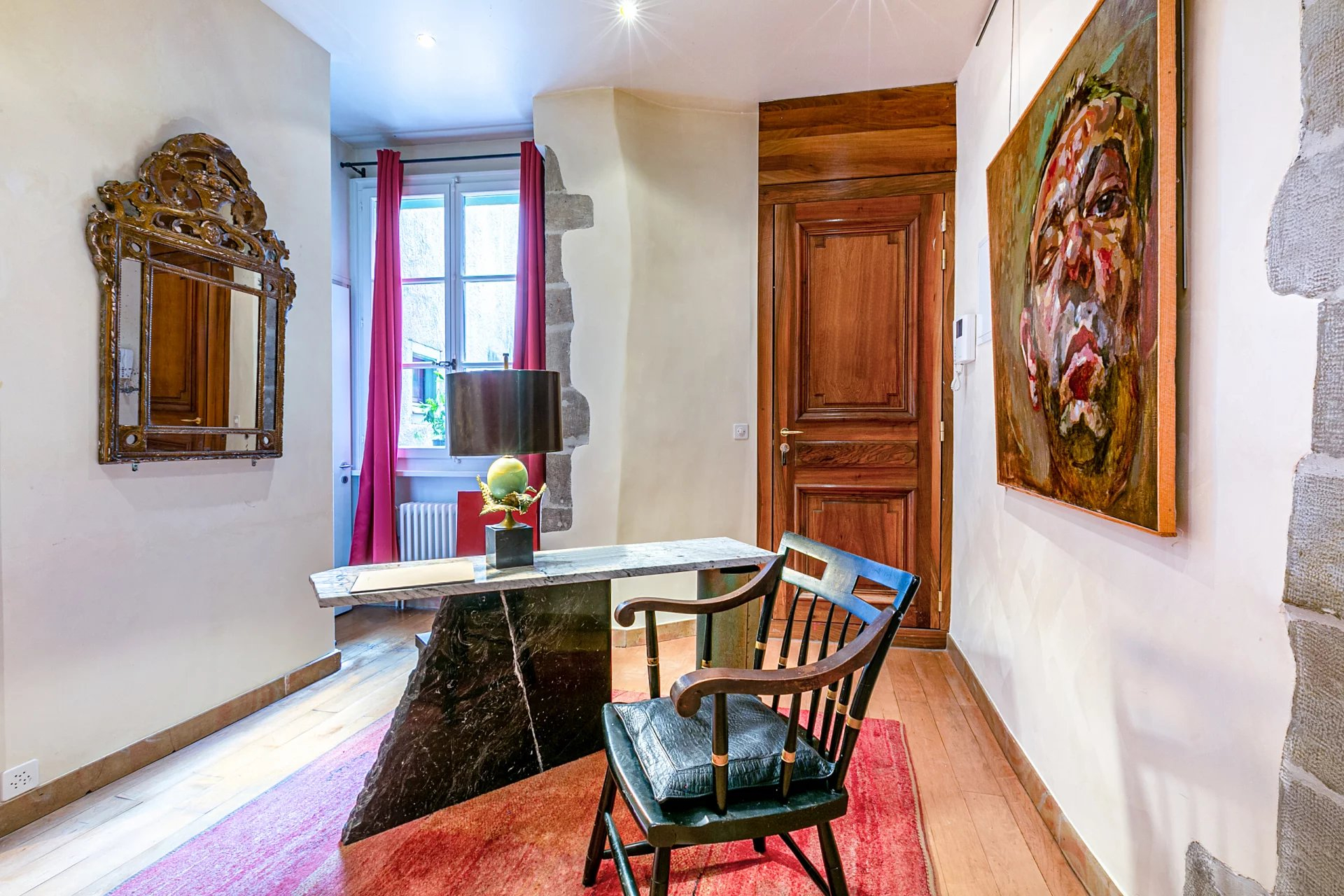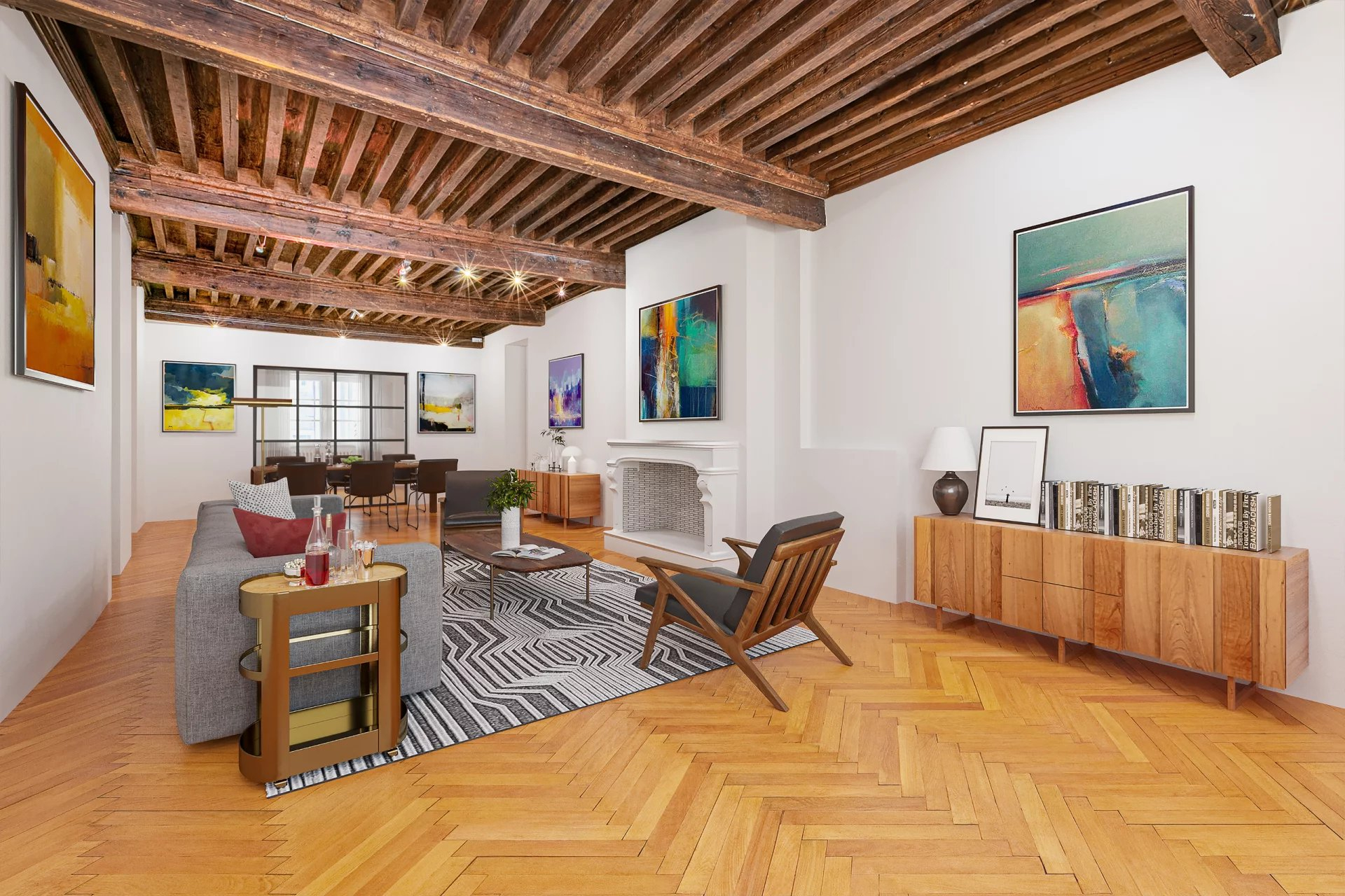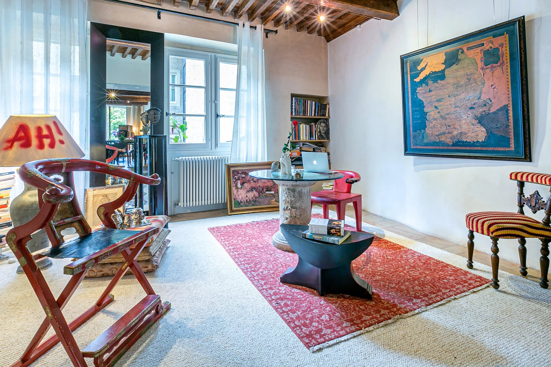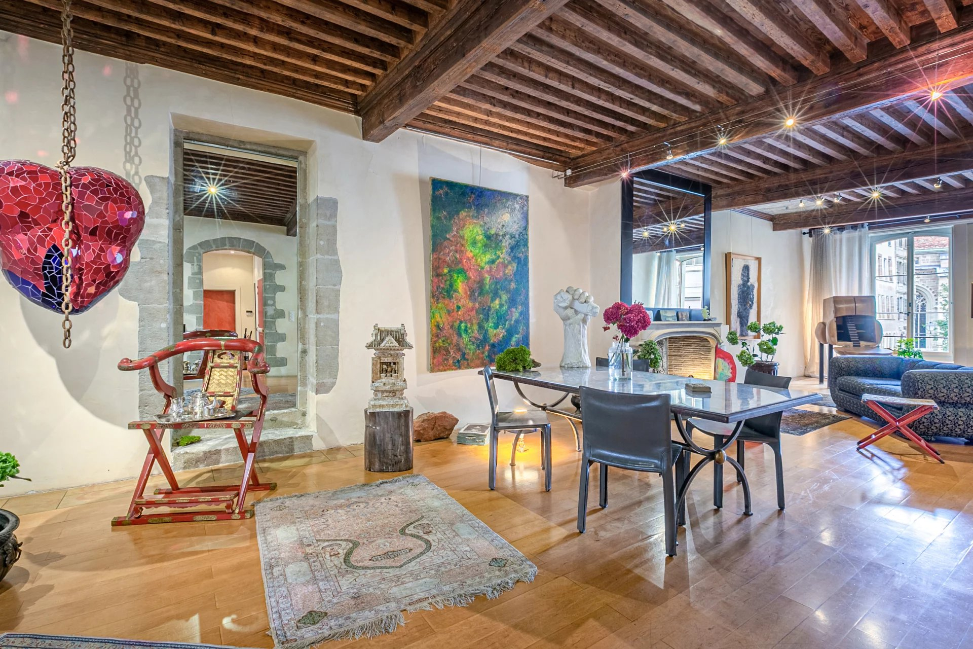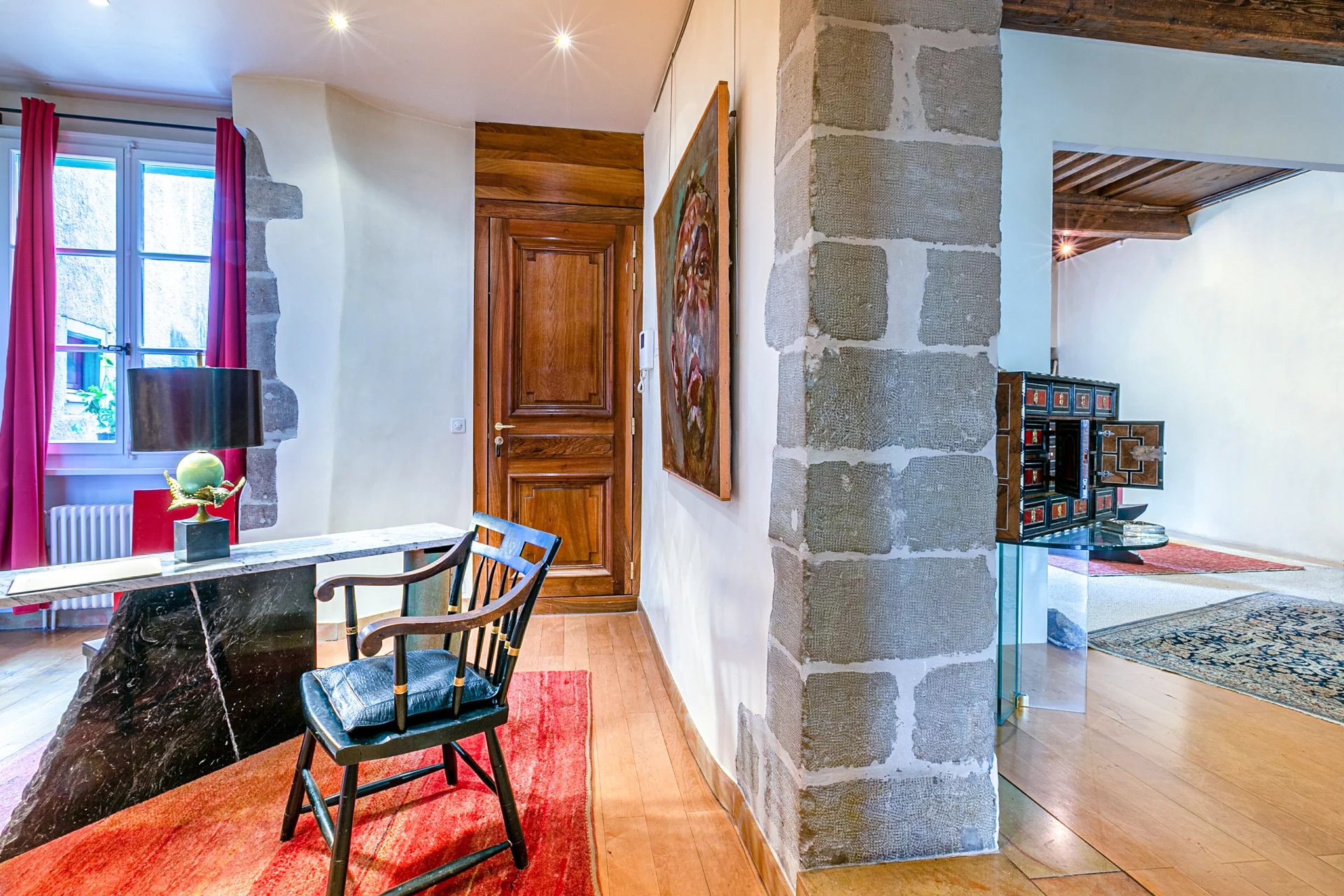 Un ascenseur privatif vous introduit directement dans l'appartement qui occupe l'entier du 2ème étage. Il se compose d'un spacieux hall aménagé en bureau ainsi que d'une buanderie pour la partie jour. Une cuisine équipée donnant un accès au séjour et accessible depuis le hall d'entrée. Vous trouverez une spacieuse pièce de vie, baignée par la lumière, avec poutres apparentes et hauts plafonds, agrémentée par une cheminée Louis XIV (acheté chez le plus grand antiquaire de France au Faubourg-Saint Honoré à Paris).