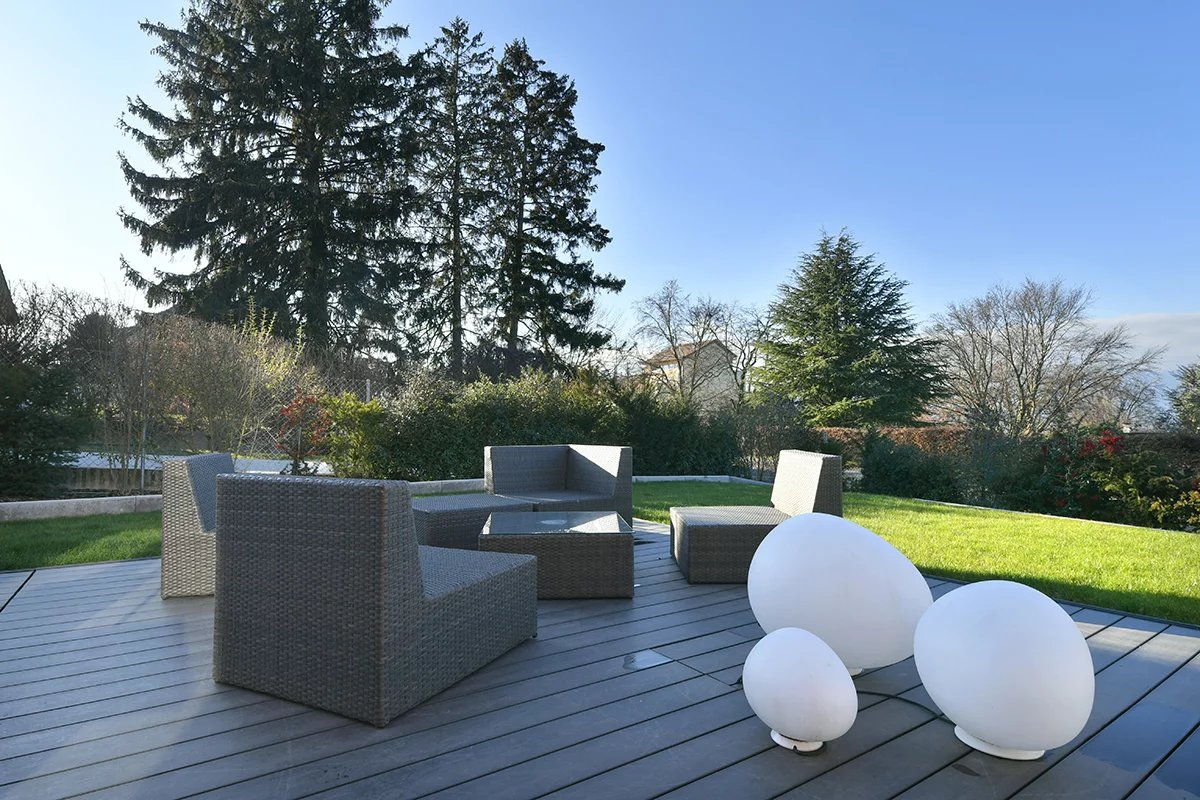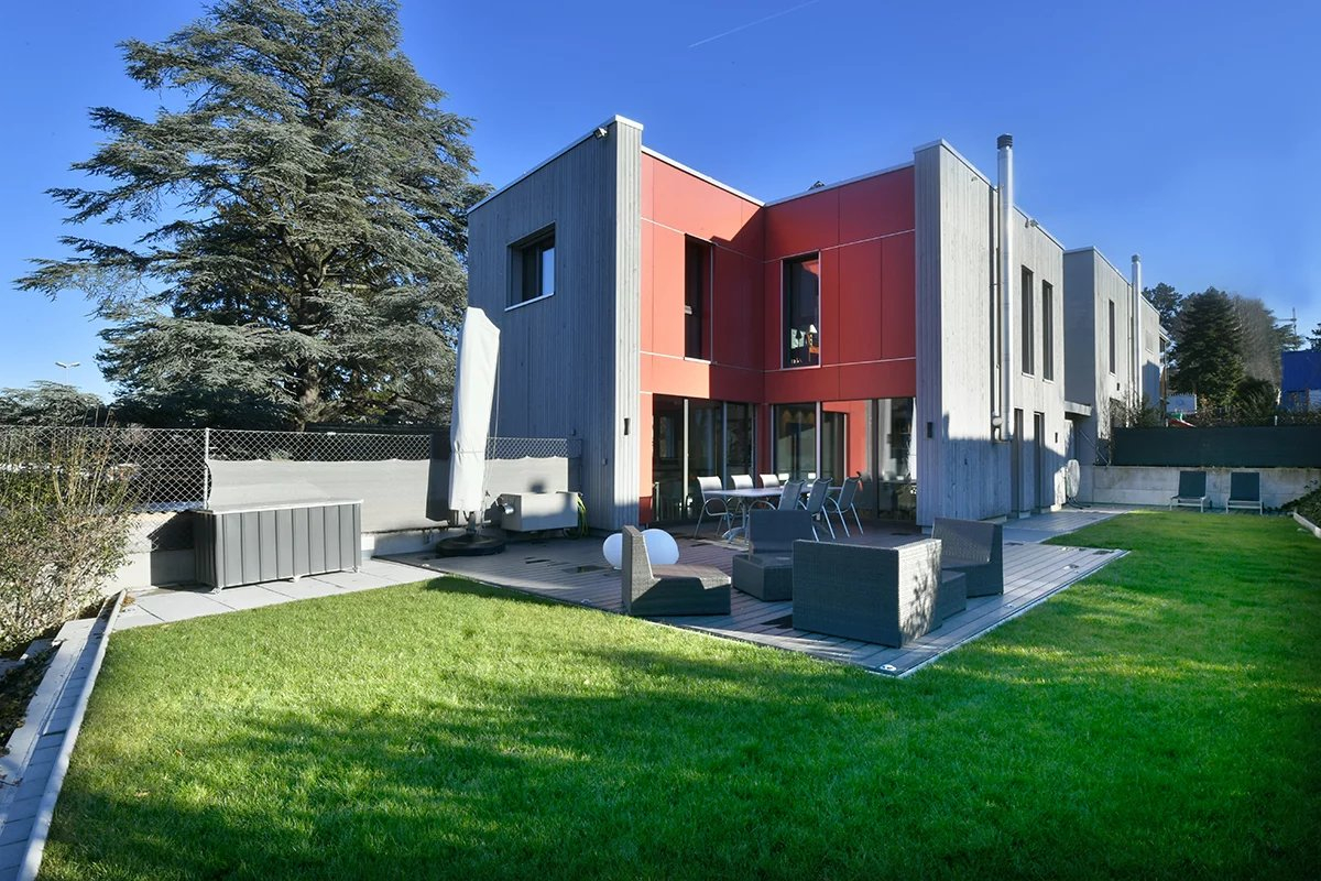 Cette maison d'un style résolument contemporain construite en 2014, est sise sur une parcelle de 483m2 située idéalement au coeur du village de Bernex, dans un quartier résidentiel au calme. A seulement quelques minutes de Genève, cette maison individuelle d'environ 150m2 habitables et plus de 240m2...