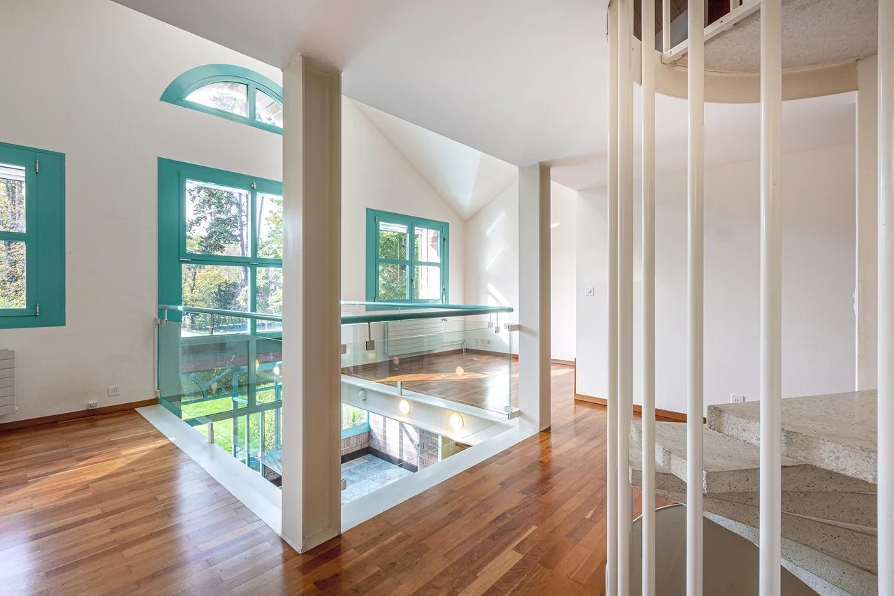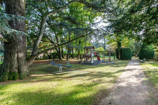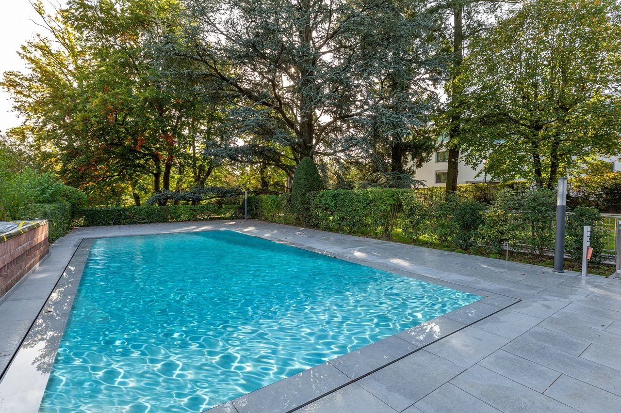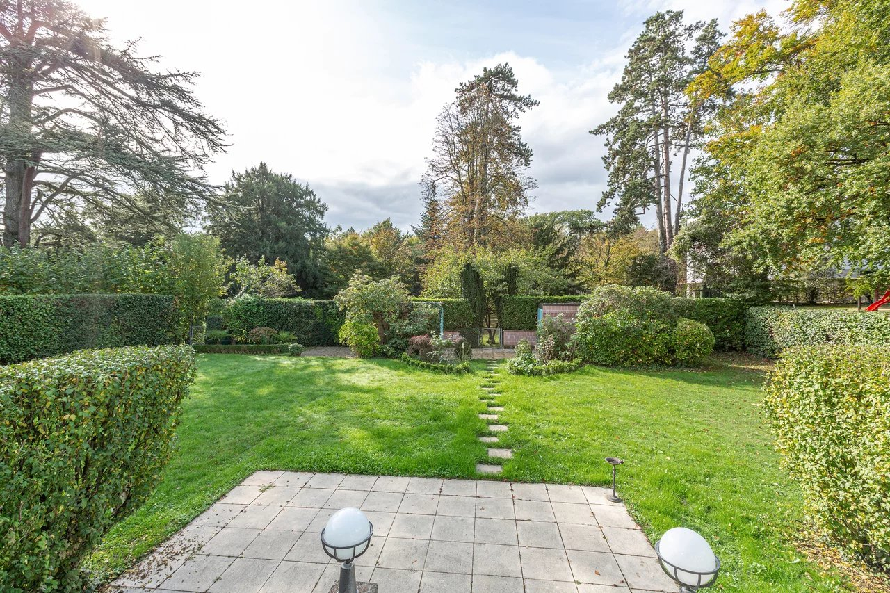 Du salon on accède à la terrasse et au jardin. Un petit portail permet d’accéder au parc en copropriété qui offre un espace jeux au milieu des arbres et une magnifique piscine.