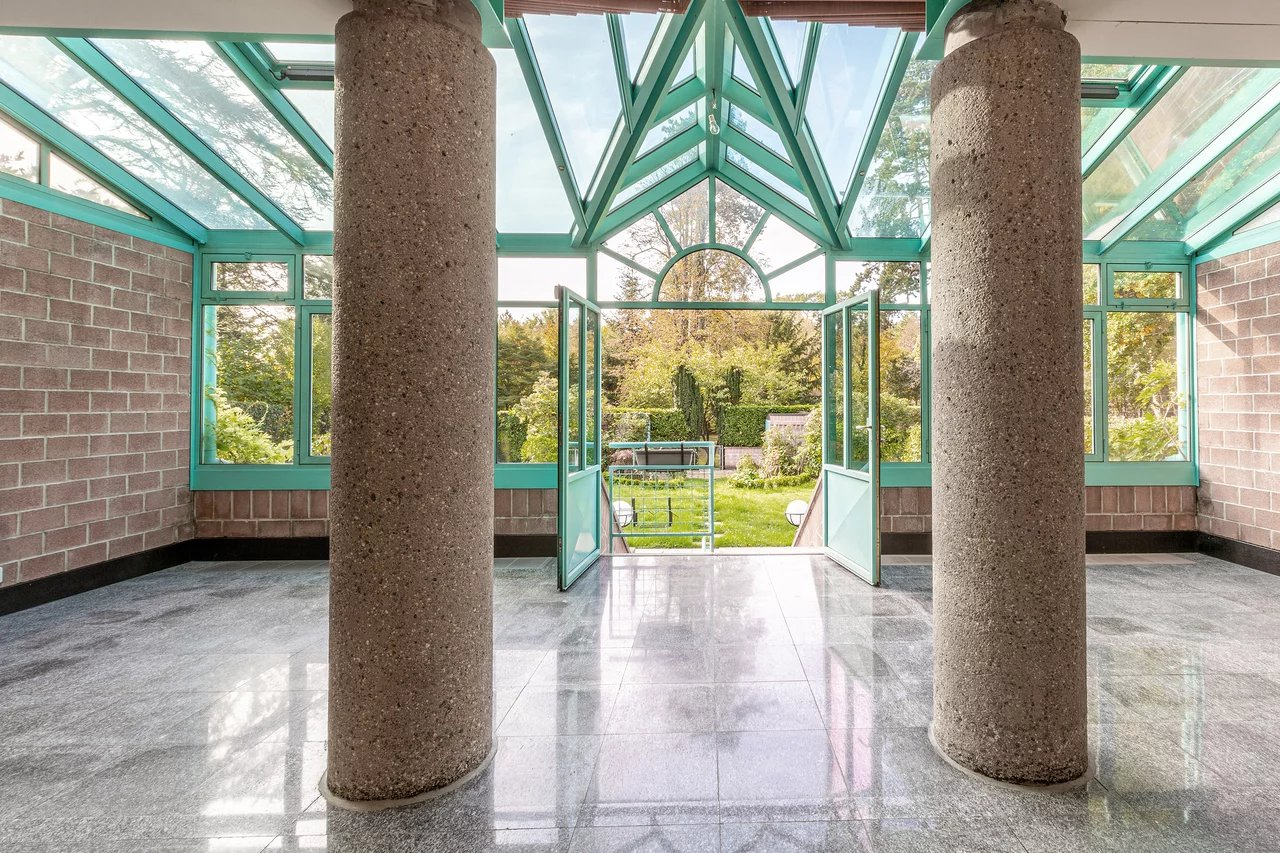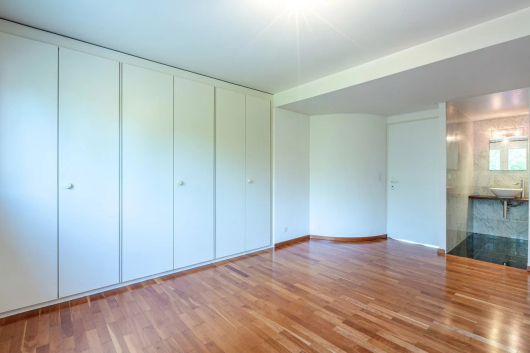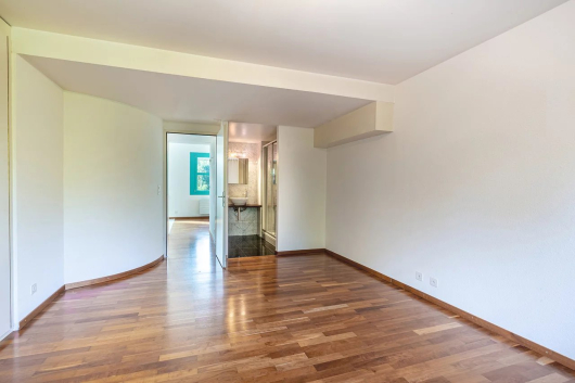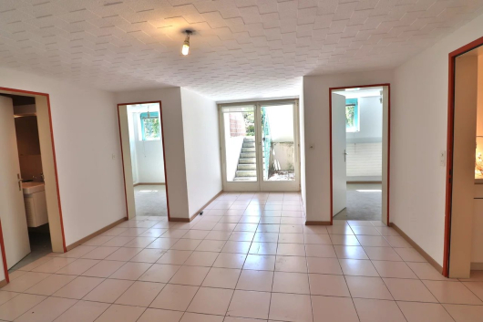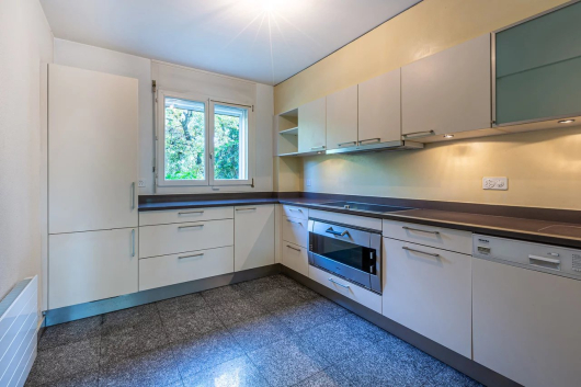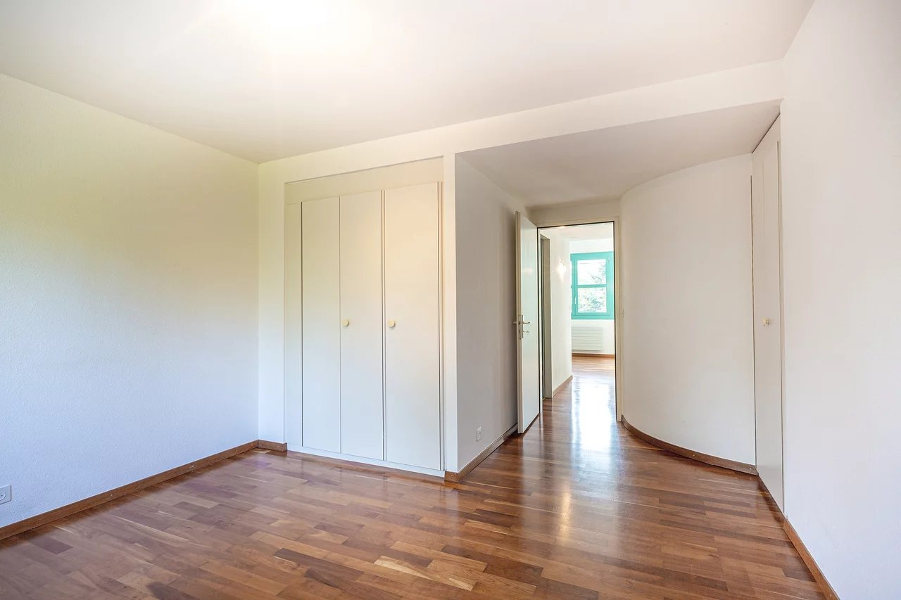 Du salon on accède à la terrasse et au jardin. Un petit portail permet d’accéder au parc en copropriété qui offre un espace jeux au milieu des arbres et une magnifique piscine.
